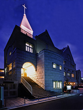 教会堂、牧師館、集会場、保育園の4つの機能を持つ複合建築であり、近習の生活、集会そして布教活動の戦いの本城をイメージしています。(設計者/有限会社三木・建築・都市デザイン研究所 三木誠)