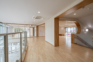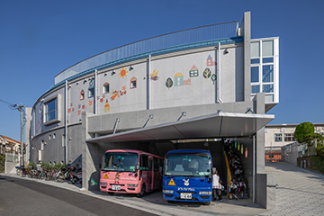 敷地形状に沿った道路側の曲面外壁は、近隣に対し音や視線が極力気にならないよう開口部を最小限にとどめた壁とし、園庭側の壁は最大限光を取入れられるよう全面ガラス張りとしています。また、雨天時に雨に濡れずに乗降できるよう、通園バスにも配慮した計画となっています。